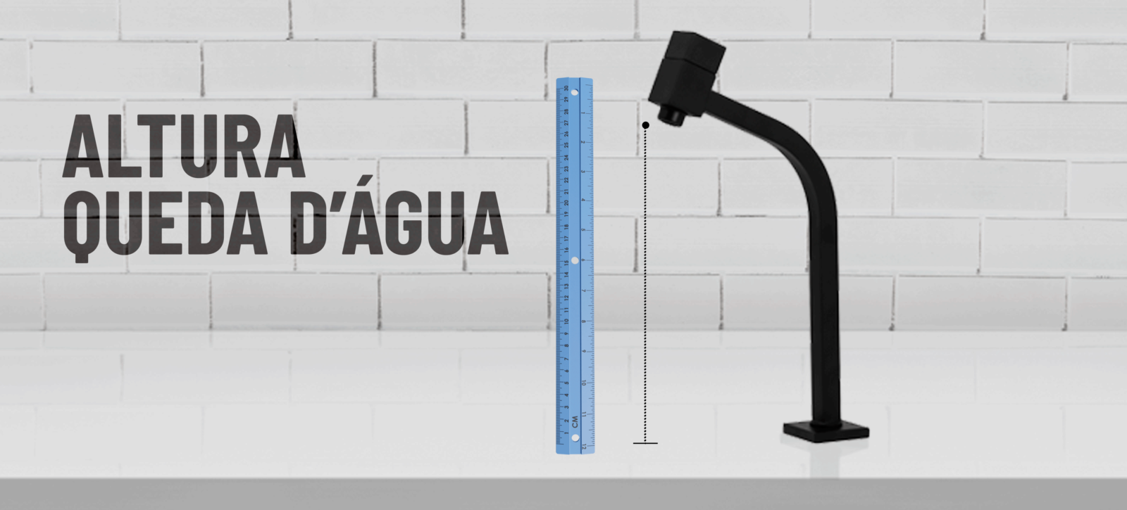 Meça a partir da bancada até os centímetros indicados (ex: 20 cm) para simular a altura da queda d’água no seu ambiente.